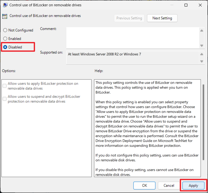 4. Selecione “Desabilitado”E clique em“Aplicar”Para evitar a ativação do BitLocker em unidades externas.