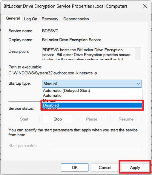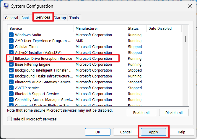 3. Encontre e desmarque “Serviço de criptografia de unidade BitLocker”serviço e clique em“Aplicar“.