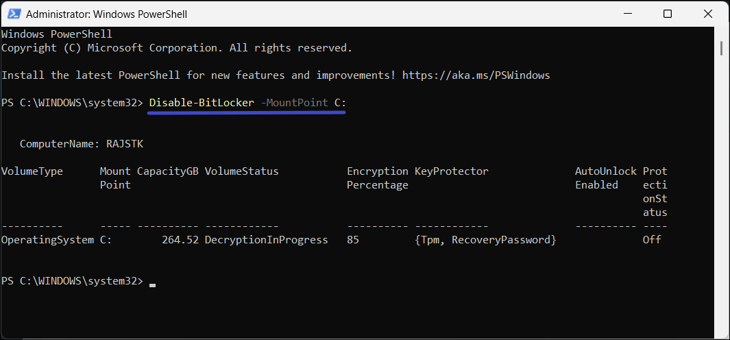 Disable-BitLocker -MountPoint <Drive_letter>: