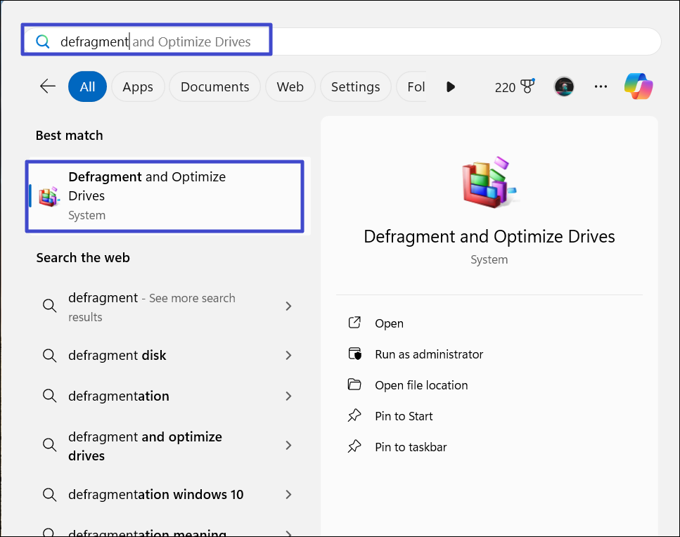 1. Clique no botão Iniciar, digite “desfragmentar”Na barra de pesquisa e selecione“Desfragmentar e otimizar unidades” a partir dos resultados.