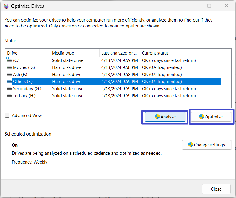 3. Primeiro, clique em “Analisar"Para analisar o disco quanto à fragmentação. Em seguida, clique em “Otimizar”Para desfragmentar a unidade.