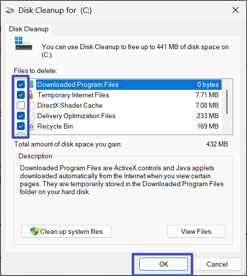 3. Em seguida, selecione os arquivos que deseja excluir, comoArquivos temporários da Internet,Lixeira,Arquivos temporários,etc., e clique em “OK“.