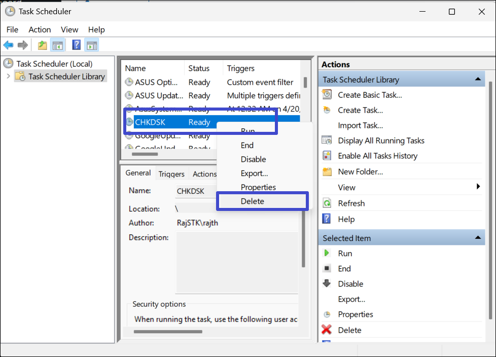 Em alguns casos, se o CHKDSK estiver definido como uma tarefa agendada, ele poderá travar na inicialização do Windows. Para evitar isso, você precisa remover o CHDSK da lista de tarefas agendadas.