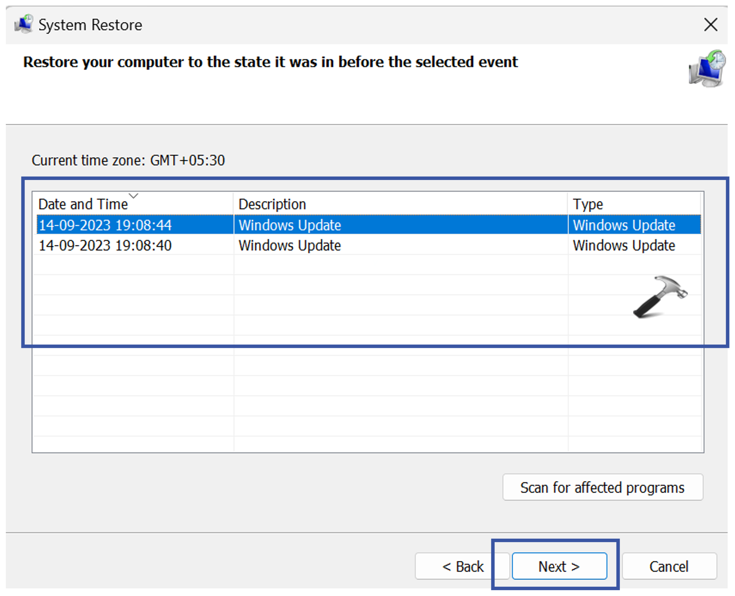 5. Selecione um ponto de restauração e clique em “Próximo".