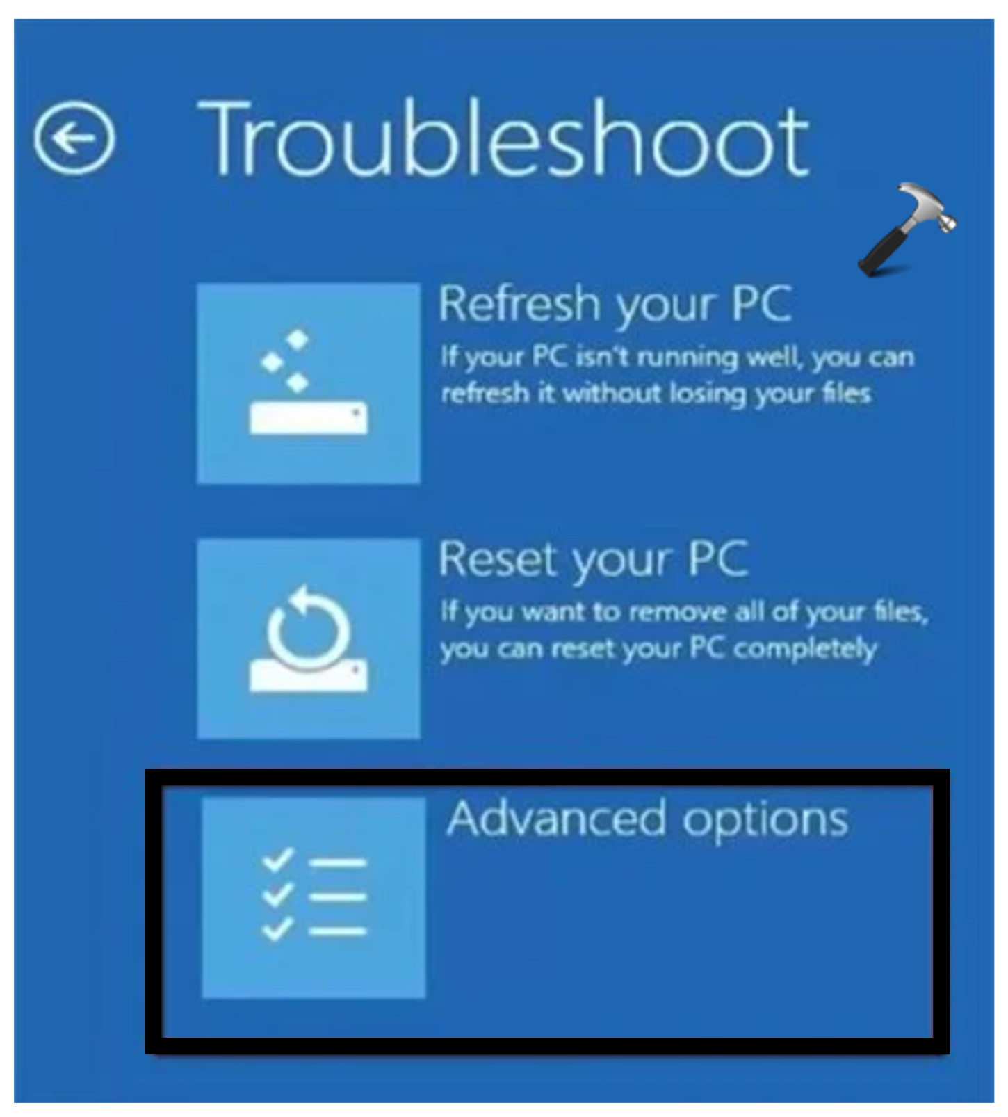 6. No “Solucionar problemas”Tela, clique em“Opções avançadas”.