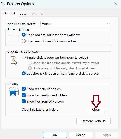 3. Clique no botão Limpar na seção Privacidade.