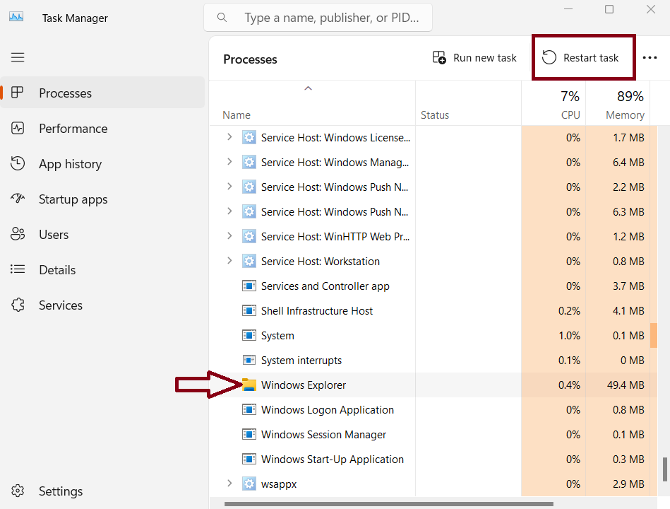 2. Clique no Windows Explorer > e clique em Reiniciar tarefa.