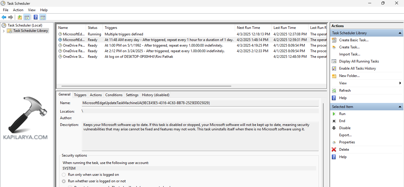 Etapa 5-Lá, o painel do meio mostrará uma lista de tarefas agendadas e o painel inferior permitirá escolher qualquer tarefa para verificar suas propriedades. Além disso, as Ações mostrarão o arquivo que será executado assim que a Tarefa Agendada for ativada.