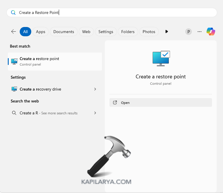 Passo 1-Primeiramente, vá para Iniciar e pesquise Criar um ponto de restauração. Abra o primeiro resultado.