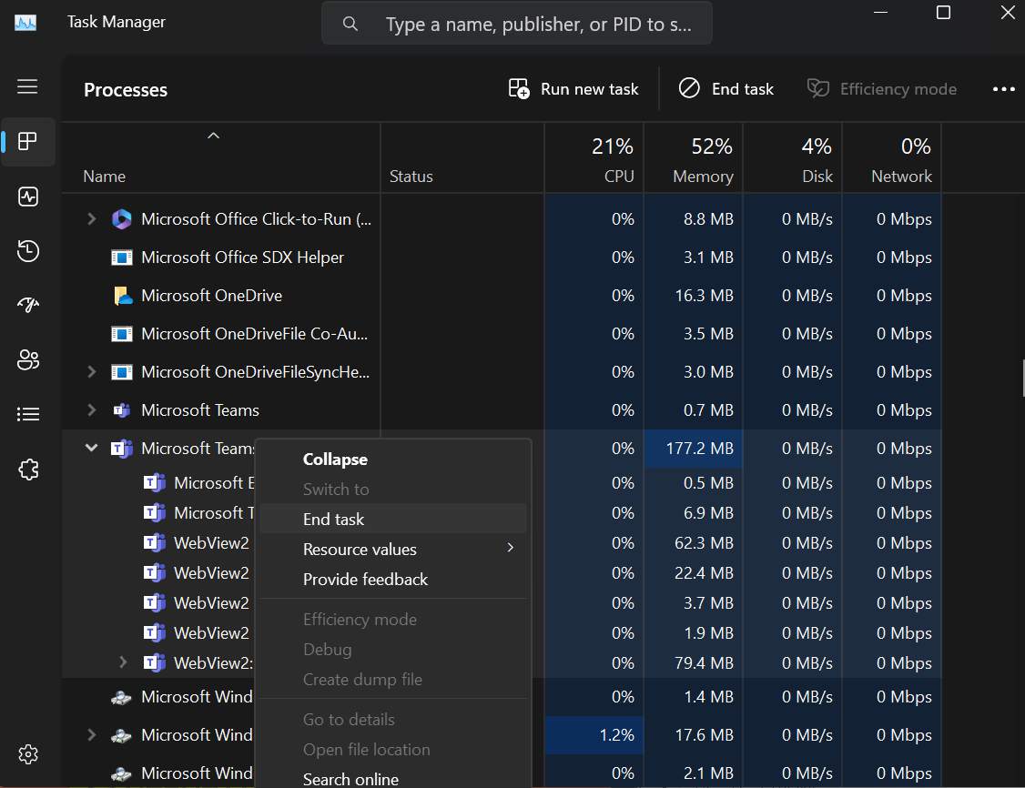 - Agora, clique com o botão direito emEquipes Microsofte selecioneFinalizar tarefano menu de contexto.