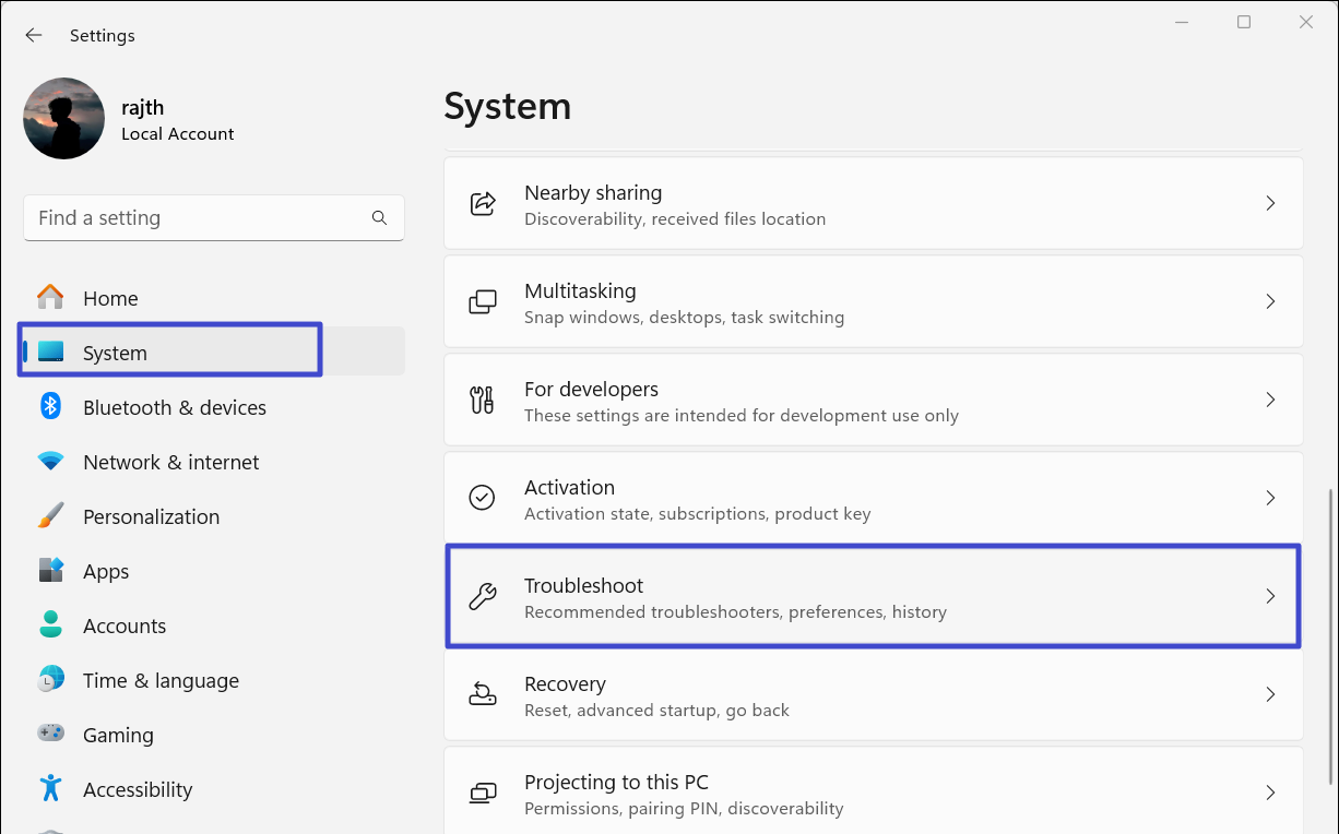 1. Nas configurações do Windows, vá para “Sistema”E selecione“Solucionar problemas“.