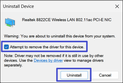 4. Verifique o “Tente remover o driver deste dispositivo”opção e clique em “Desinstalar“.