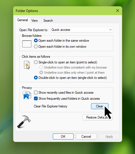- Em Opções de Pasta, na guia Geral, clique emClaropara Limpar histórico do File Explorer.