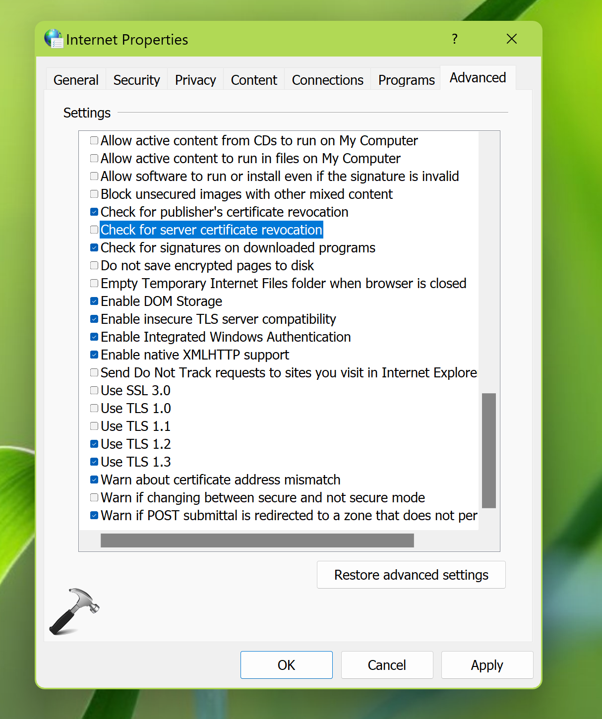 3. Em Configurações, remova a marca de Verificar revogação de certificado do servidor. Clique em Aplicar, OK.