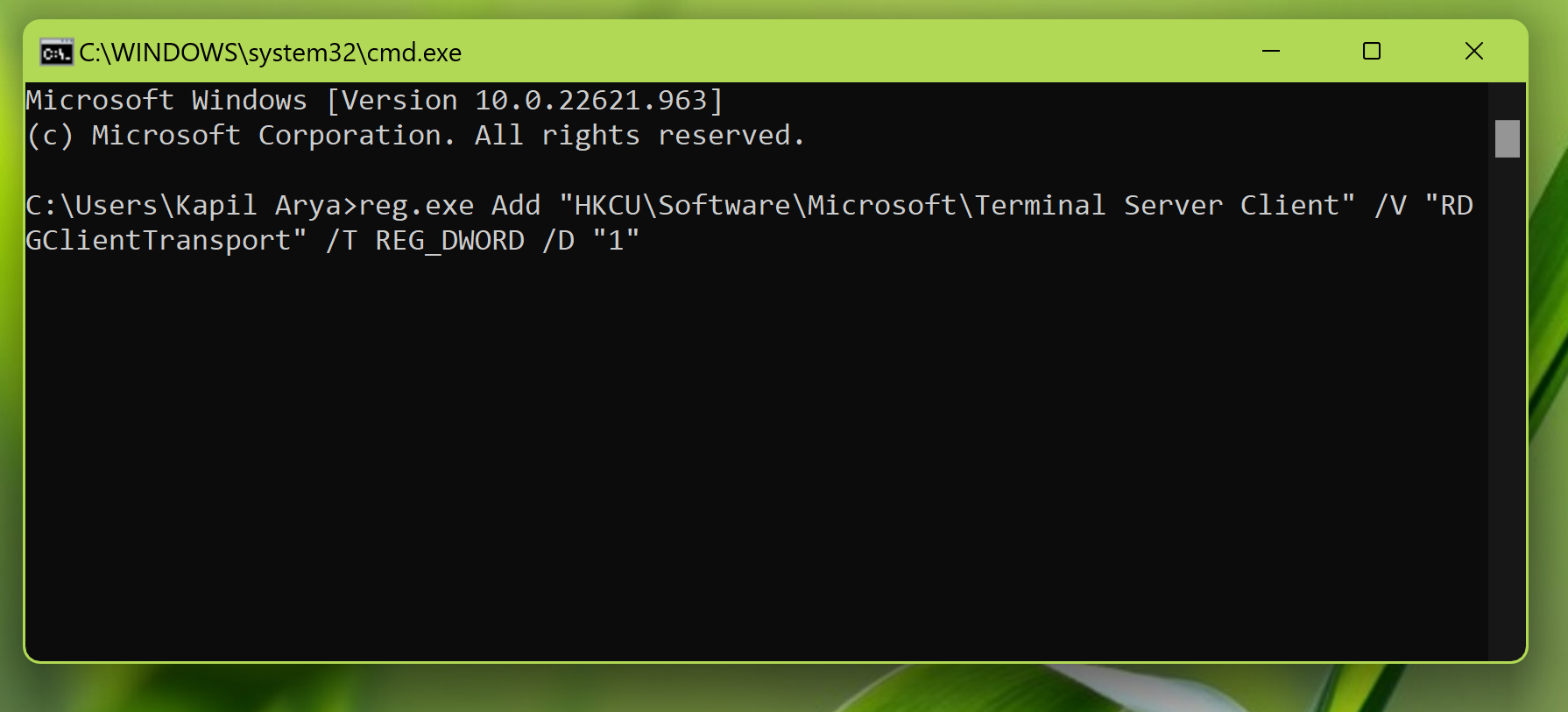 reg.exe Add "HKCUSoftwareMicrosoftTerminal Server Client" /V "RDGClientTransport" /T REG_DWORD /D "1"