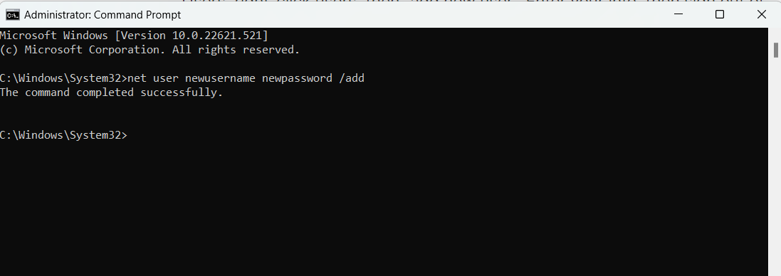 - Digite o seguinte comando com o novo nome de usuário e a nova senha.