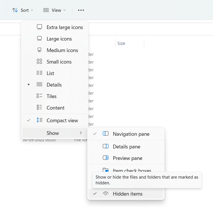 - Abra o explorador de arquivos nesta nova conta e vá para odisco rígido do sistema. Aqui, clique emvisualizar > Mostrar > Itens ocultos.