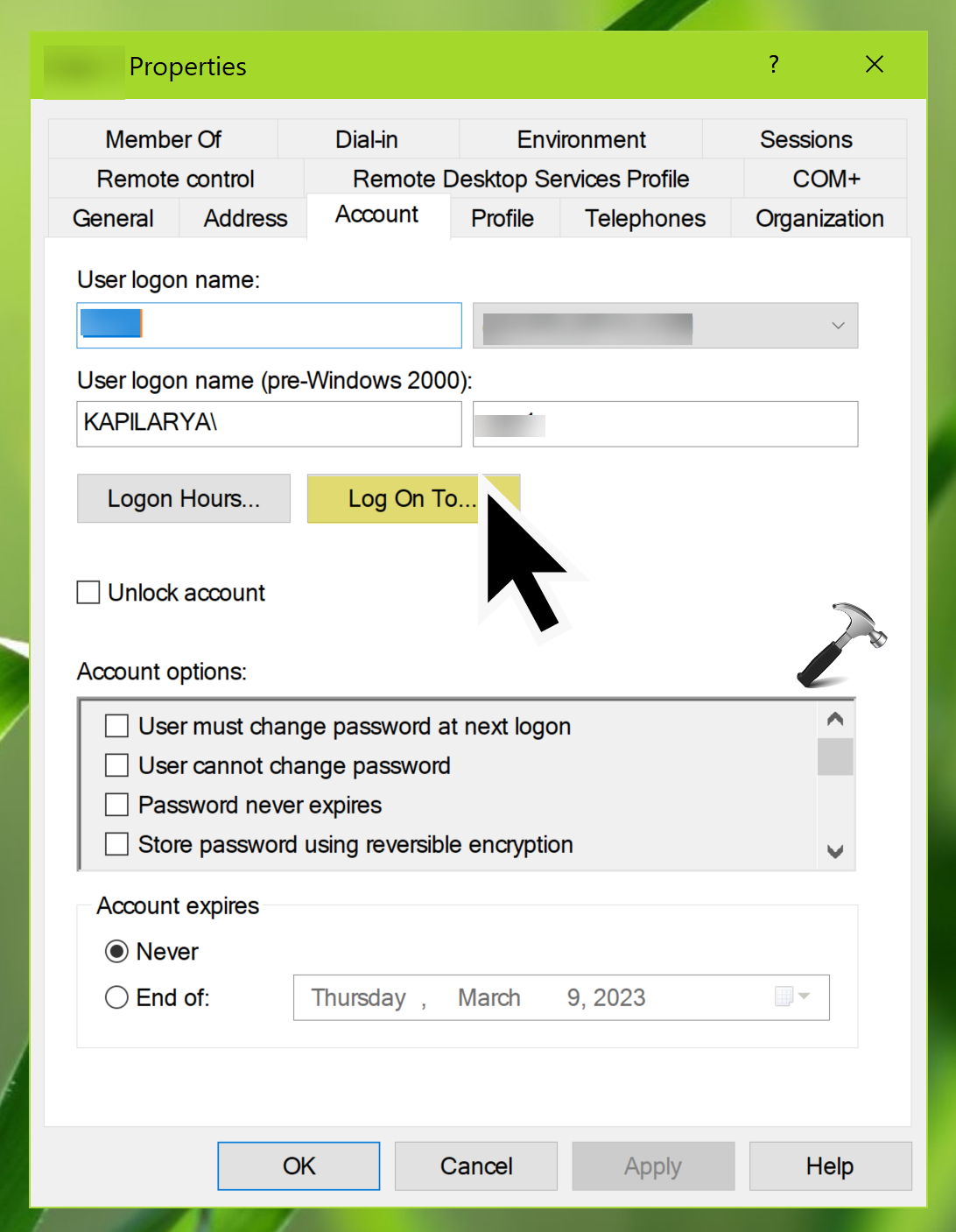 3. Na folha de propriedades, mude para a guia Conta. Clique emFaça logon em…botão aí.