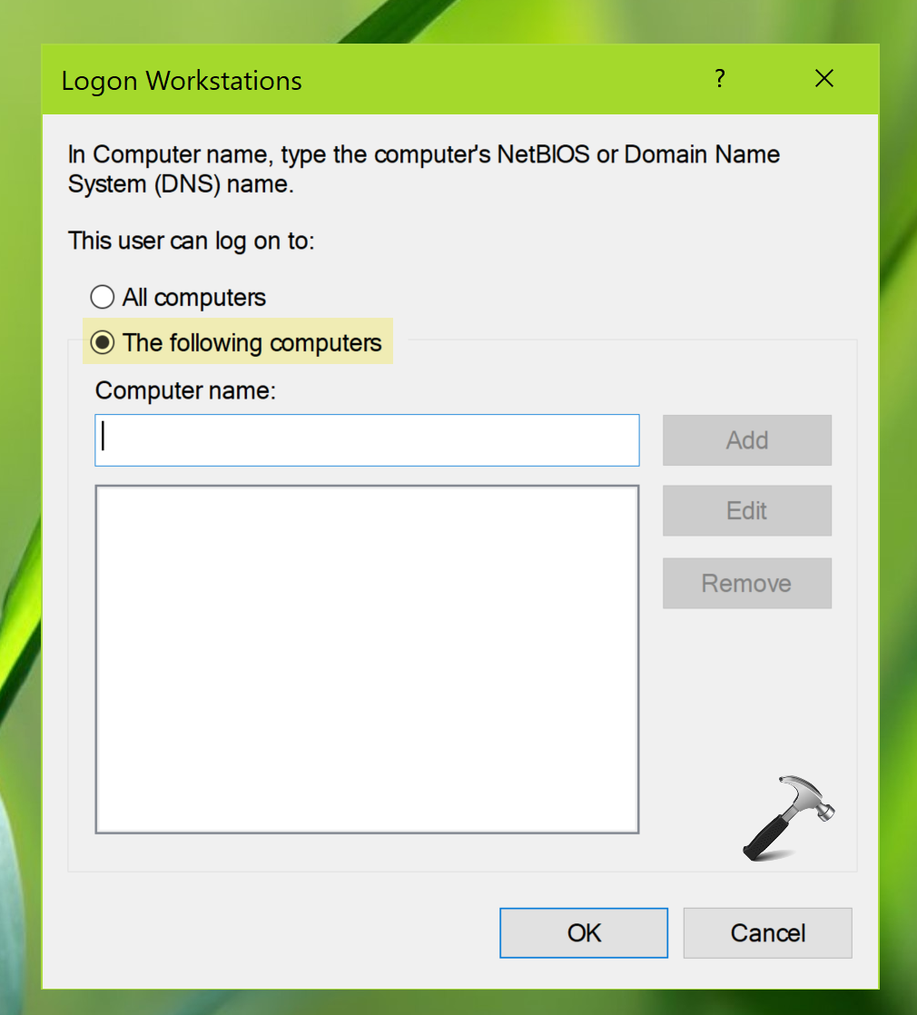 4. Em seguida, em Estações de trabalho de logon, selecioneOs seguintes computadores. Em seguida, digite os nomes dos computadores de origem e de destino aos quais você está tentando se conectar. Por fim, clique em OK para salvar as alterações.