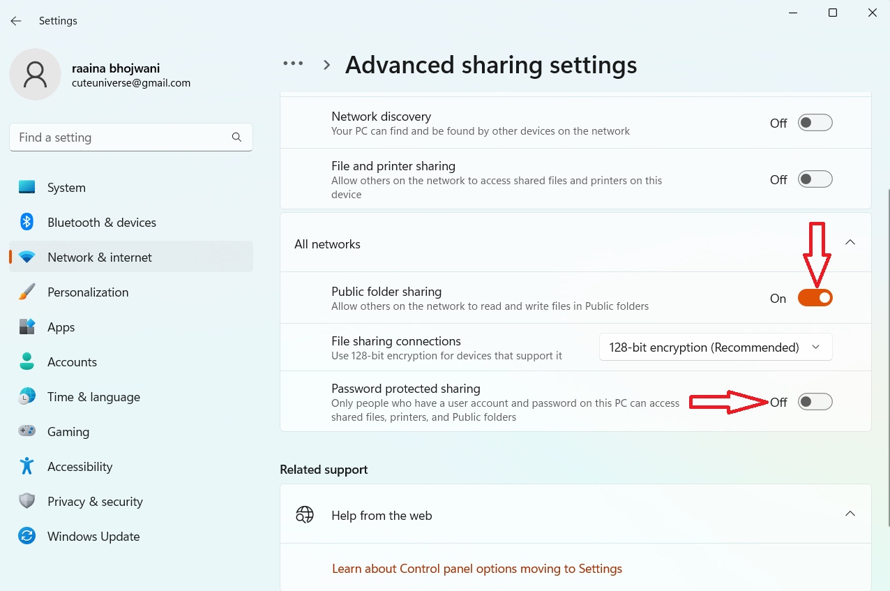 Em seguida, ligue oCompartilhamento de pasta públicaopção e desligueCompartilhamento protegido por senhaopção.