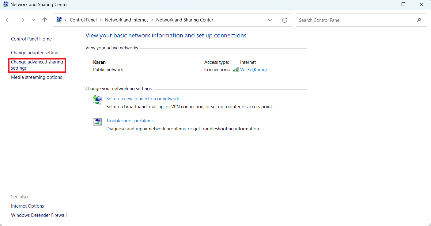 A seguir, clique emAlterar configurações avançadas de compartilhamento.