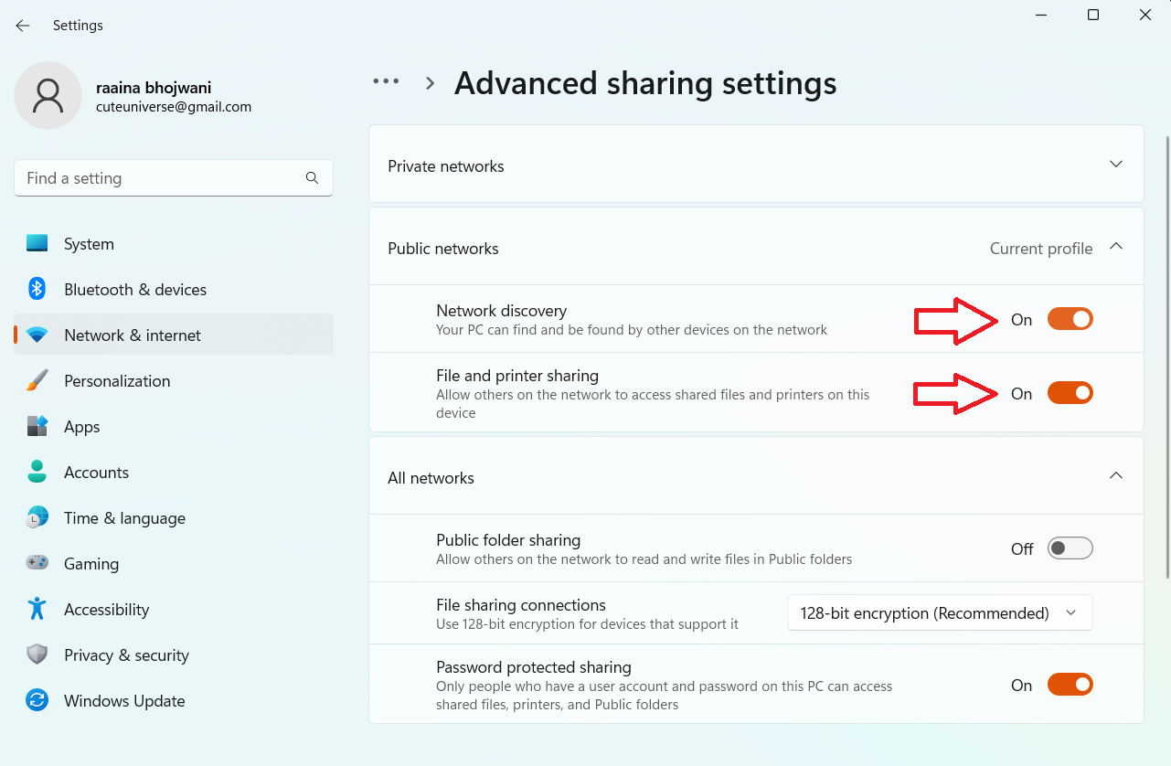 Agora ligueDescoberta de redeeCompartilhamento de arquivos e impressorasopções.