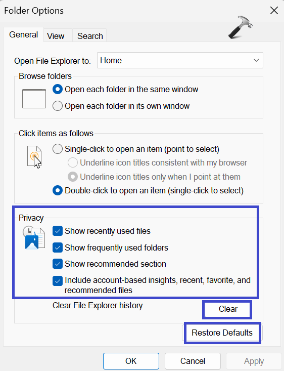 Correção 1: limpar o histórico do File Explorer e restaurar os padrões