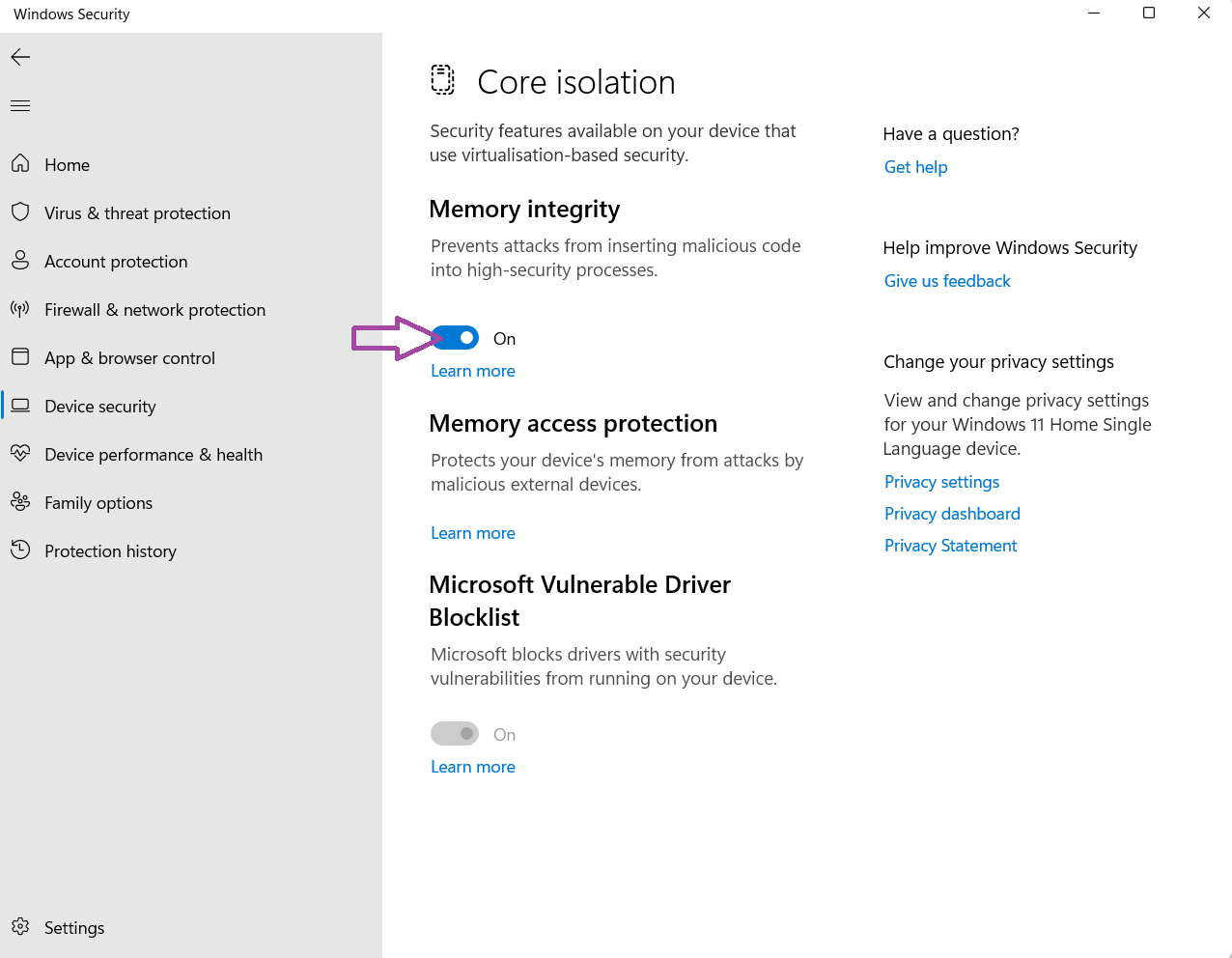 Você pode desativar temporariamente a integridade da memória apenas para resolver esse problema usando estas etapas simples: