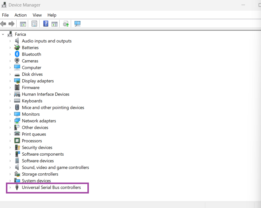 2. Expanda Controladores Universal Serial Bus e clique com o botão direito no dispositivo USB.