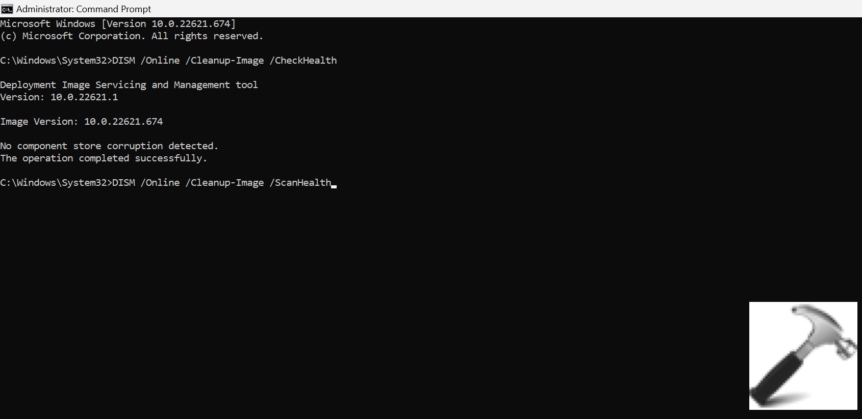 DISM /Online /Cleanup-Image /CheckHealth DISM /Online /Cleanup-Image /ScanHealth DISM /Online /Cleanup-Image /RestoreHealth