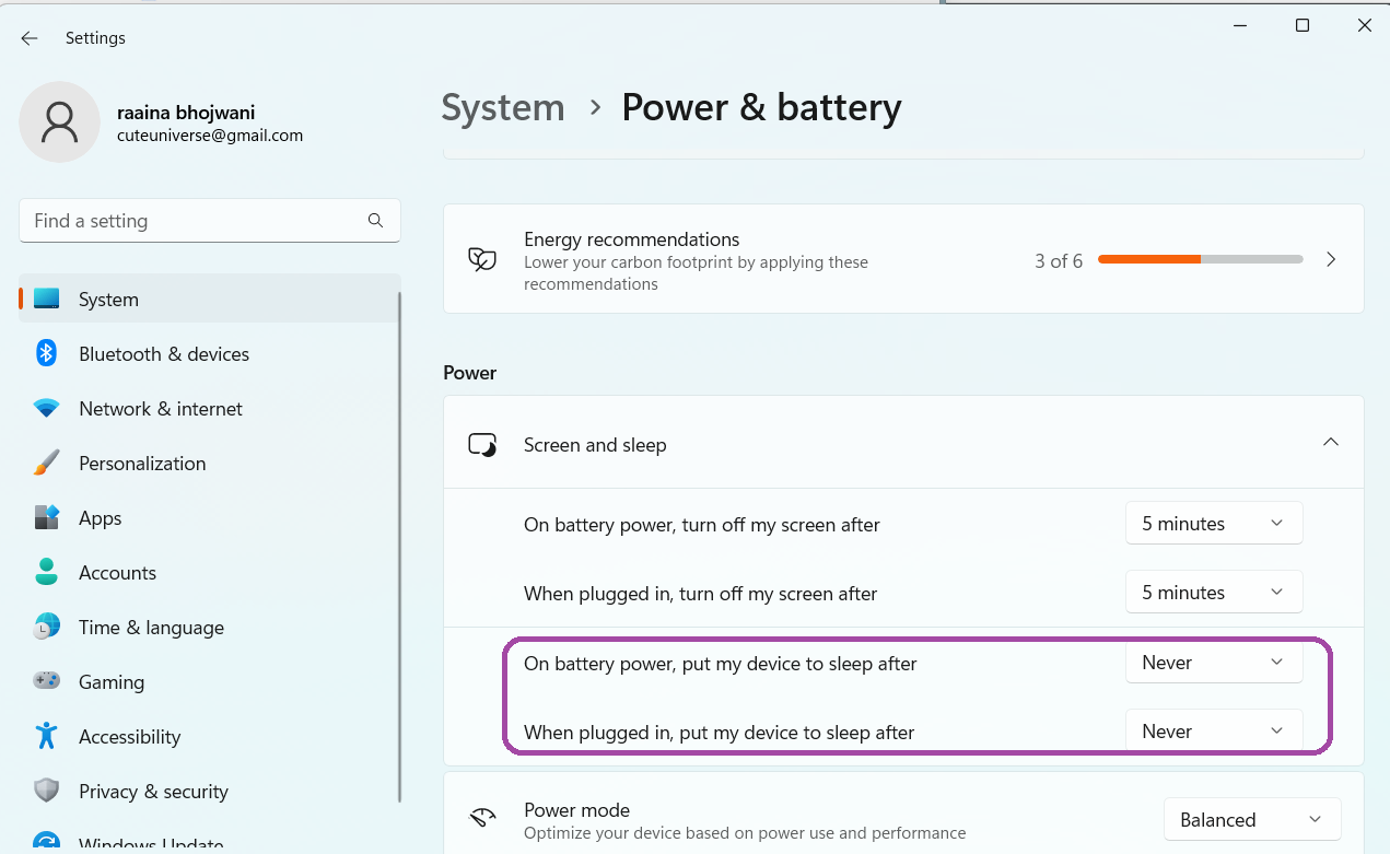 2. Clique emTela e sono. Selecione “Nunca” emCom energia da bateria, coloque meu dispositivo em hibernação depois, eQuando conectado, coloco meu dispositivo em hibernação depois.