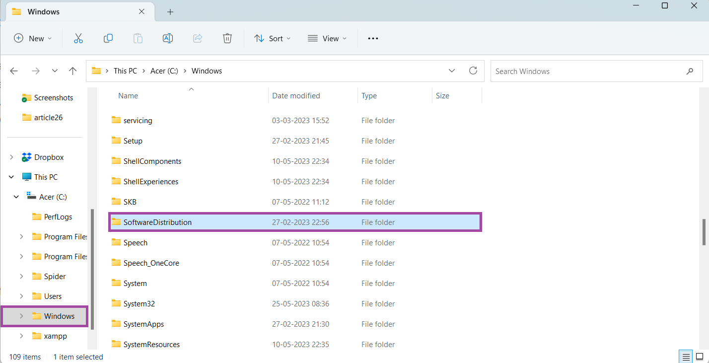 A pasta SoftwareDistribution é uma pasta do sistema do Windows que armazena arquivos temporários relacionados ao Windows Update. Primeiro, você deve interromper o serviço Windows Update para garantir que nenhum arquivo esteja em uso. Abra o aplicativo Serviços, localize o serviço “Windows Update”, clique com o botão direito nele e selecione “Parar”. Assim que o serviço for interrompido, navegue até a pasta SoftwareDistribution no diretório C:Windows.