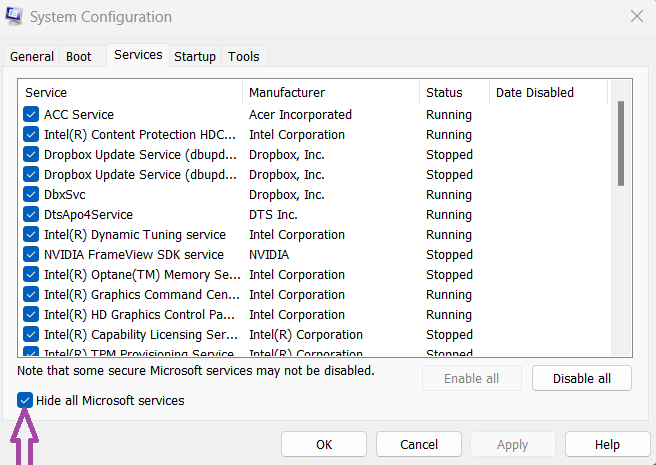 A seguir, clique noServiçosaba e verifiqueOcultar todos os serviços Microsoftcaixa de seleção.
