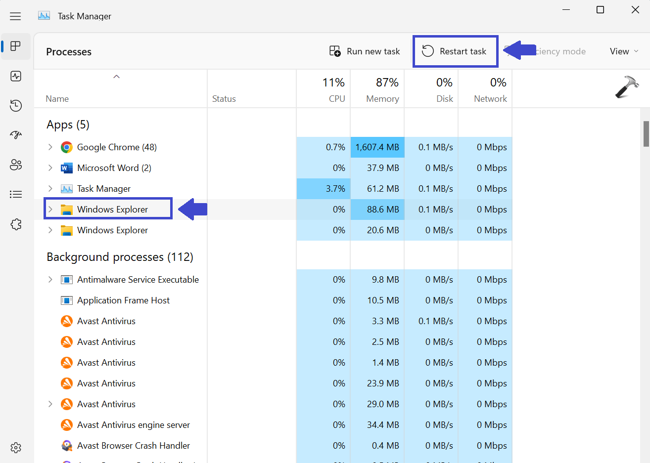 3. Encontre o Windows Explorer e clique em Reiniciar tarefa.