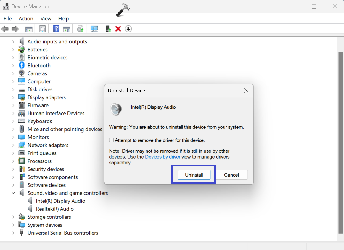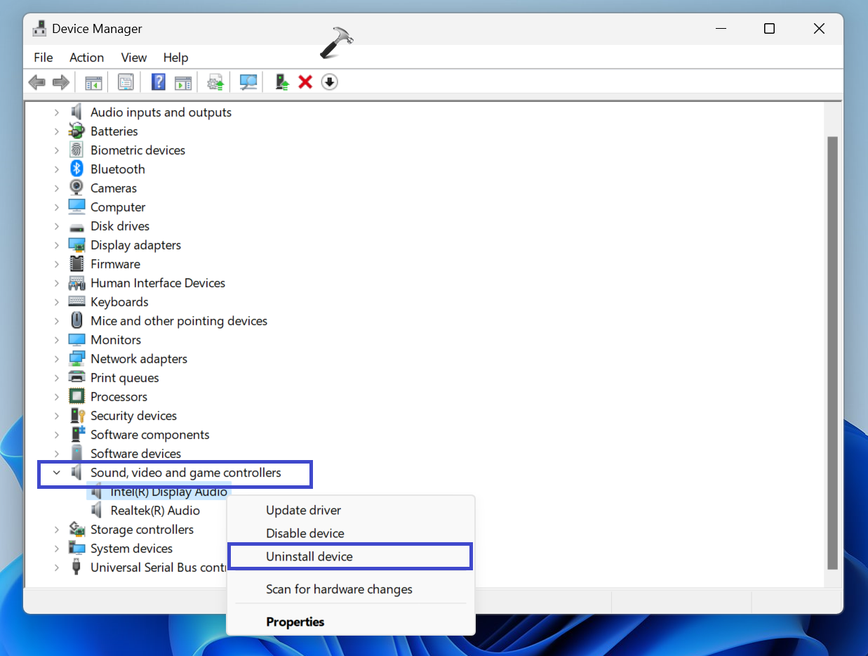 3. Clique com o botão direito no dispositivo de áudio e clique em “Desinstalar dispositivo“.