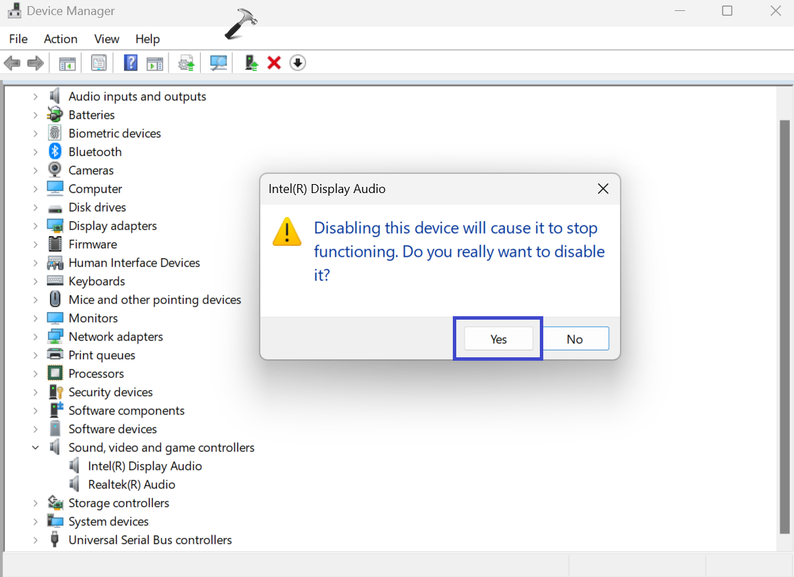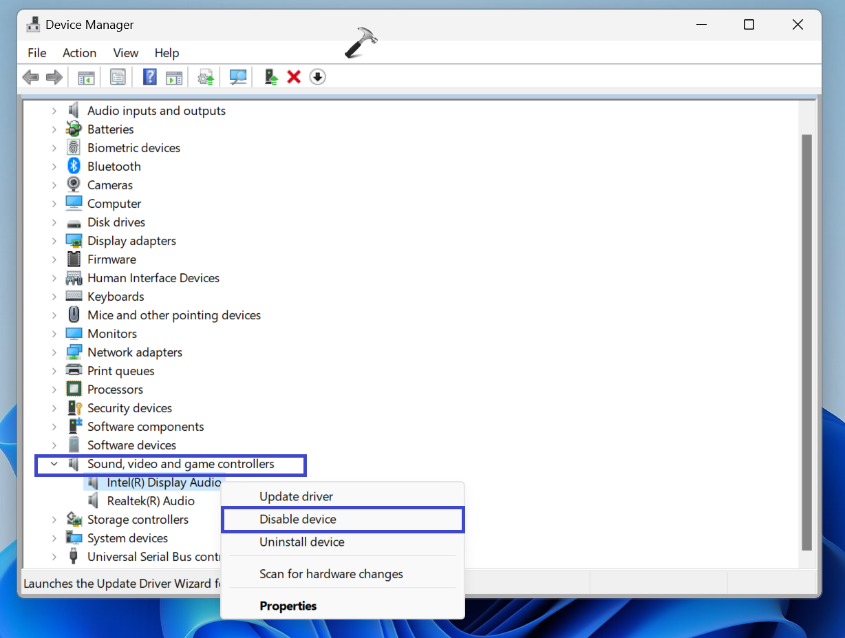 3. Clique com o botão direito no dispositivo de áudio e clique em “Desativar dispositivo“.
