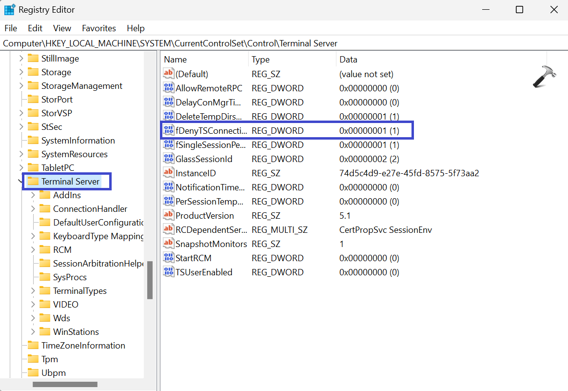 HKEY_LOCAL_MACHINESYSTEMCurrentControlSetControlTerminal Server