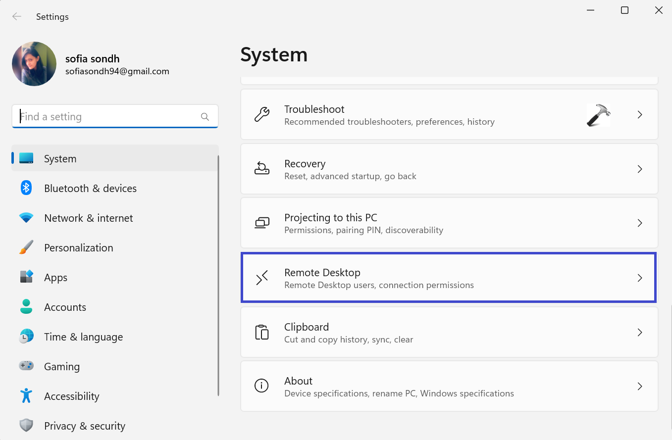 Certifique-se de que a Área de Trabalho Remota esteja habilitada em seu computador. Faça o seguinte: