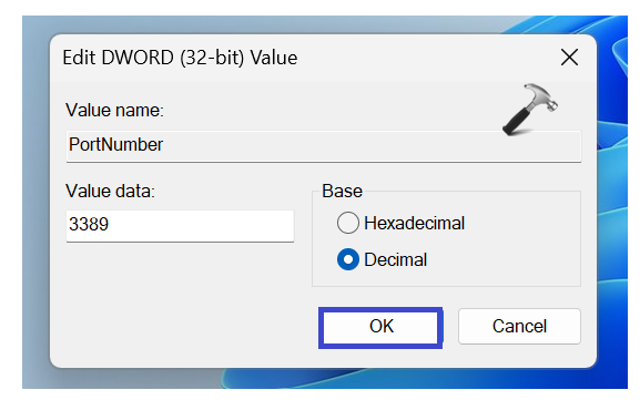 Selecione o valor decimal e defina o valor como 3389. Clique em OK.