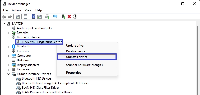 Método 4: desinstalar drivers de dispositivos biométricos