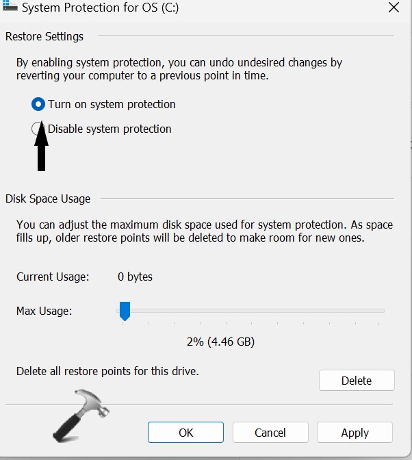 6. Agora, clique noControle deslizante de uso máximoe selecione o espaço a ser reservado para armazenar os pontos de restauração.