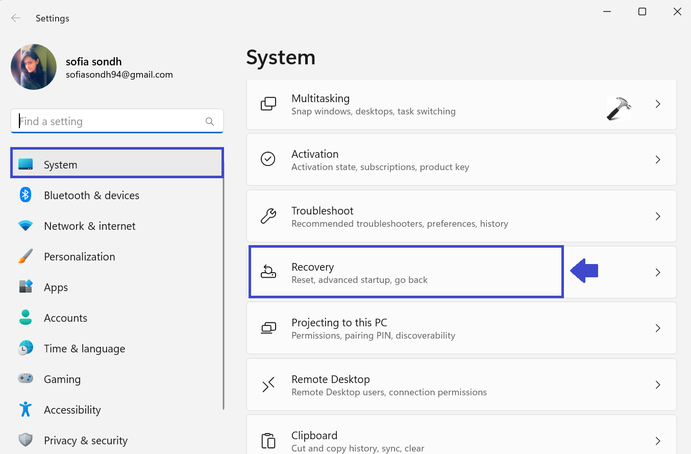 2. Em “Sistema”, selecione “Recuperação”.