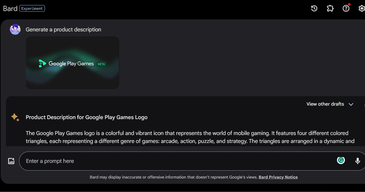 Por exemplo, para gerar uma descrição de produto para um novo par de sapatos, os usuários podem fazer upload de uma imagem dos sapatos em sua conversa com o Bard e depois pedir a Bard para gerar uma descrição do produto. Bard então geraria uma descrição que incluiria a imagem dos sapatos.