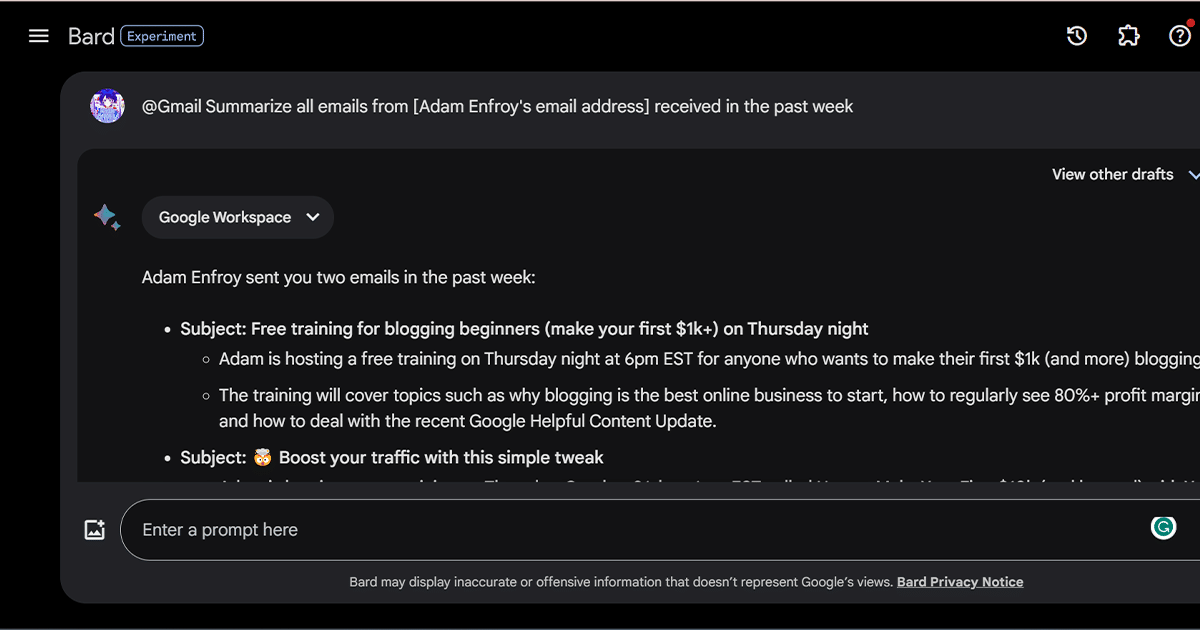 Para usar o Bard para resumir e-mails, basta digitar @Gmail no prompt. Bard então acessará a conta do Gmail do usuário e gerará resumos de seus e-mails recentes. Os usuários também podem especificar quais e-mails desejam que o Bard resuma, fornecendo as linhas de assunto do e-mail ou os endereços de e-mail dos remetentes.