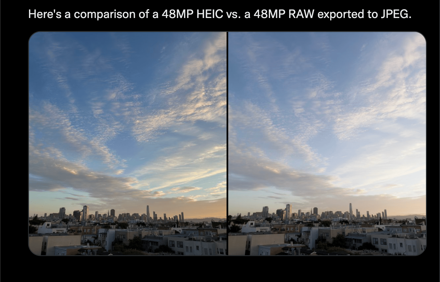 - ProRAW em 48 MP ou 12 MP no iPhone 14 Propara os usuários escolherem entre qualidade máxima ou tamanhos de arquivo mais baixos. No entanto, o RAW nativo não está disponível atualmente em 48 MP, apenas imagens RAW nativas armazenadas em 12 MP.