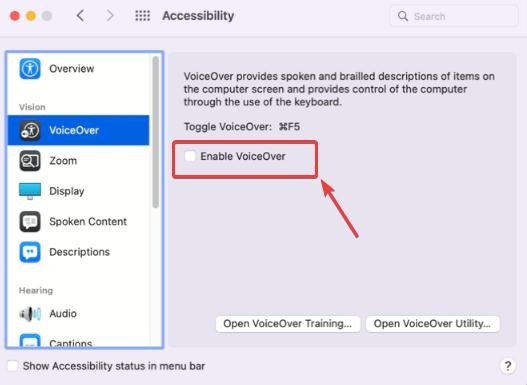 - Desmarque a caixa de seleção que dizHabilitar VoiceOver
