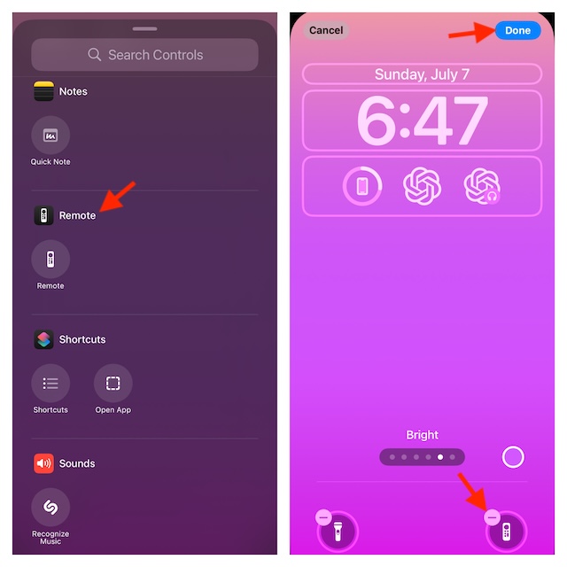 - Na tela de bloqueio do iPhone, mantenha pressionada a tela -> botão Personalizar na parte inferior de um papel de parede -> Tela de bloqueio -> toque no botão menos na parte superior do botão do Apple TV Remote.