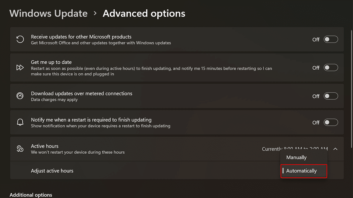 - Clique no botão “Horário ativo”configuração> selecione oManualmenteopção > especifique quando o horário ativo deve começar para evitar que o sistema seja reiniciado automaticamente e especifique quando o horário ativo deve terminar para permitir que o sistema reinicie automaticamente, se necessário.