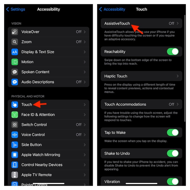 - Vá para oAplicativo de configurações no seu iPhone -> Acessibilidade -> Toque -> AssistiveTouch.