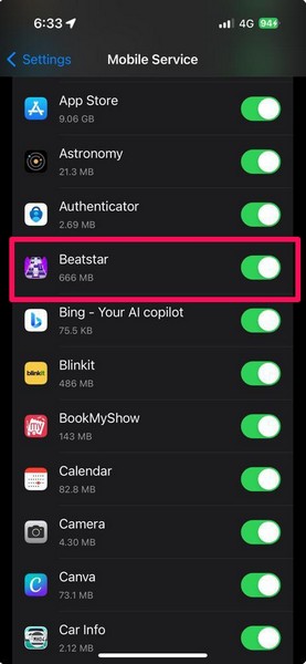 4. Toque no botão de alternância ao lado do jogo selecionadoparaproibir o uso de dados móveisserviço.